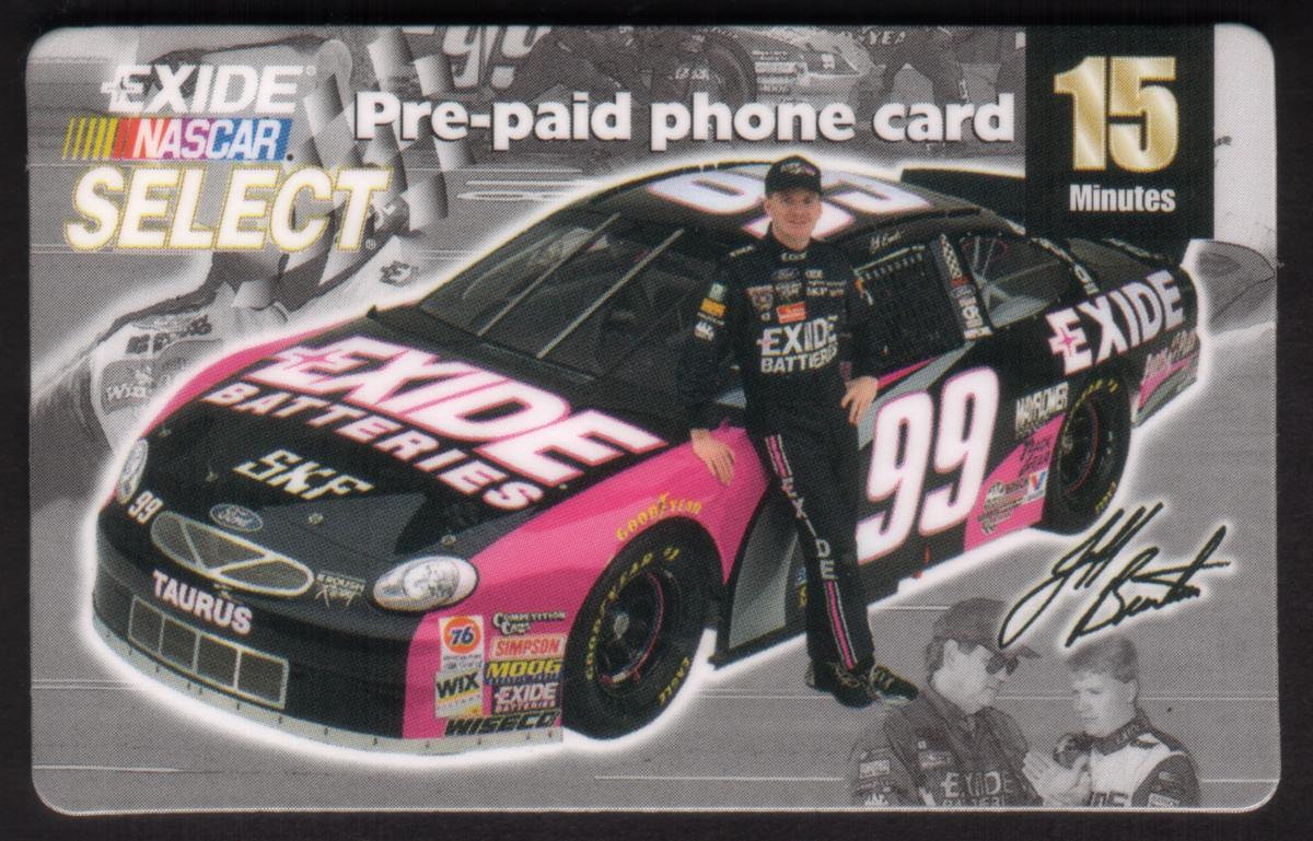 The card includes text indicating it is a "Pre-paid phone card" offering 15 minutes of usage. The upper left corner features the "Exide NASCAR Select" logo, highlighting the connection to NASCAR and the promotional nature of the card. The overall design presents a racing theme associated with Jeff Burton, reflecting the corporate sponsorship of Exide Batteries and the motorsport branding.