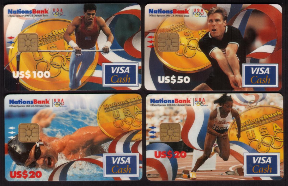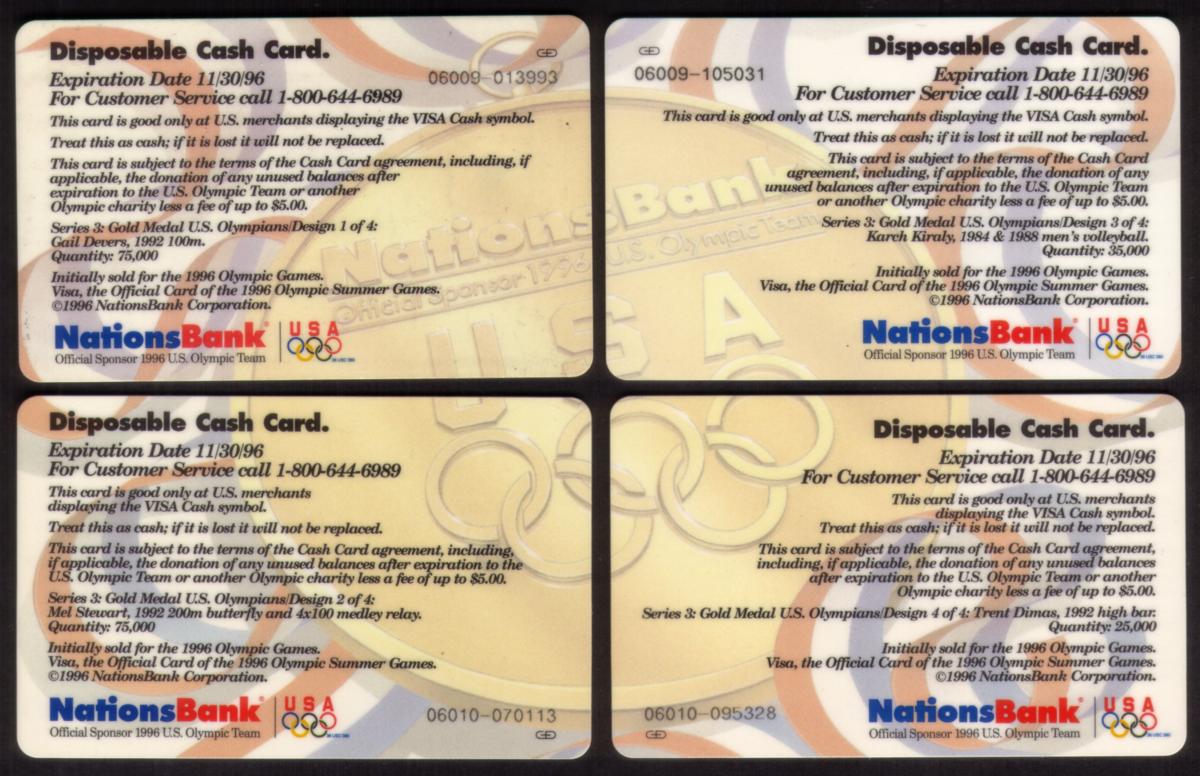 These collectible Visa Cash Cards from NationsBank are part of a 1996 Olympics gold medals series featuring U.S. Olympians. The set includes denominations of US$20, US$20, and US$100, with the cards marked "Official Sponsor 1996 U.S. Olympic Team" by NationsBank. Each card prominently displays the visa cash logo and a gold medal graphic with the USA Olympic rings. The athletes pictured are associated with Olympic sports, including a female sprinter on the US$20 card shown first, a male swimmer on the second US$20 card, and a male gymnast on the US$100 card. Each card has a chip and is labelled as a disposable cash card with an expiration date of November 30, 1996.