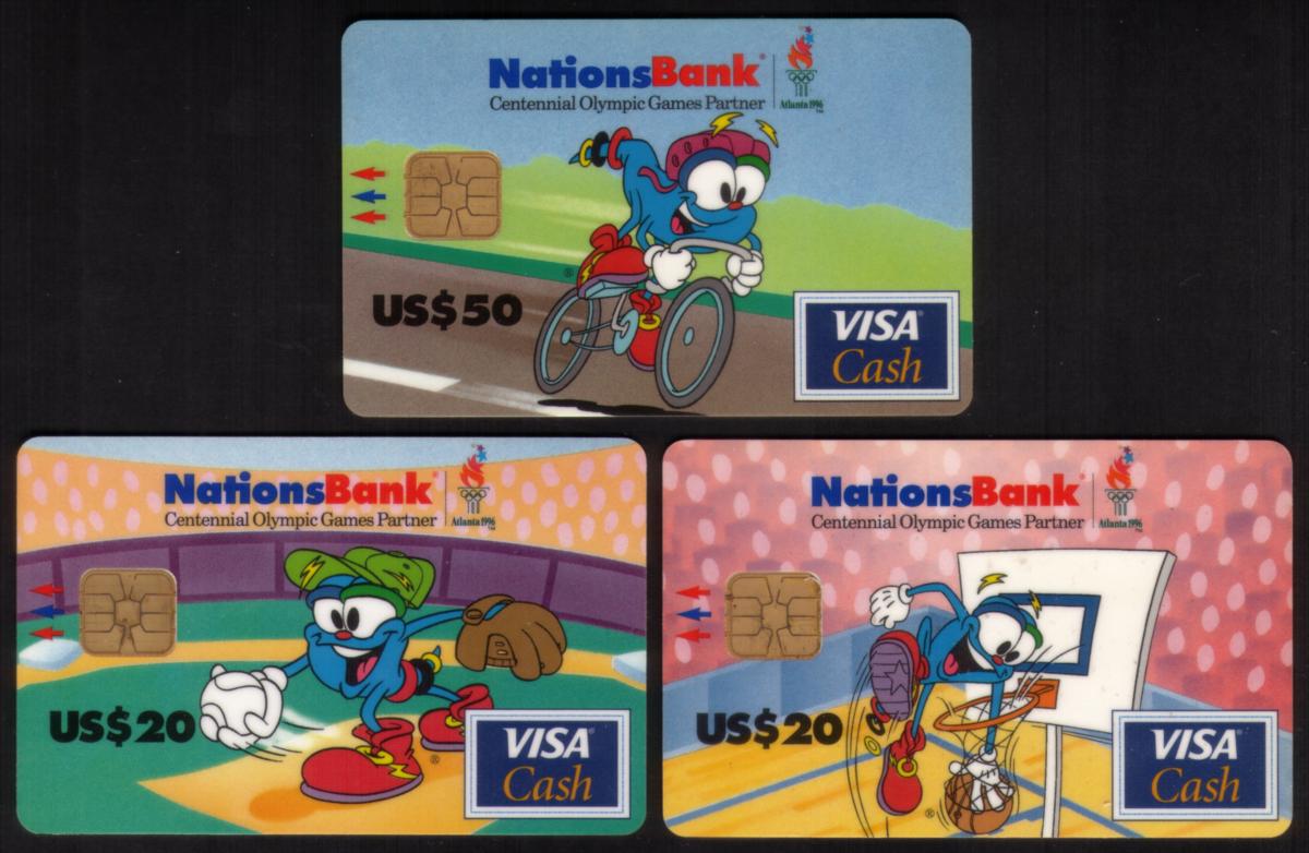 Keywords: setof, sports: olympics, izzy the mascot, bankcard, smart card, svc, stored value card, chip card, basketball, softball, bicycling, NationsBank