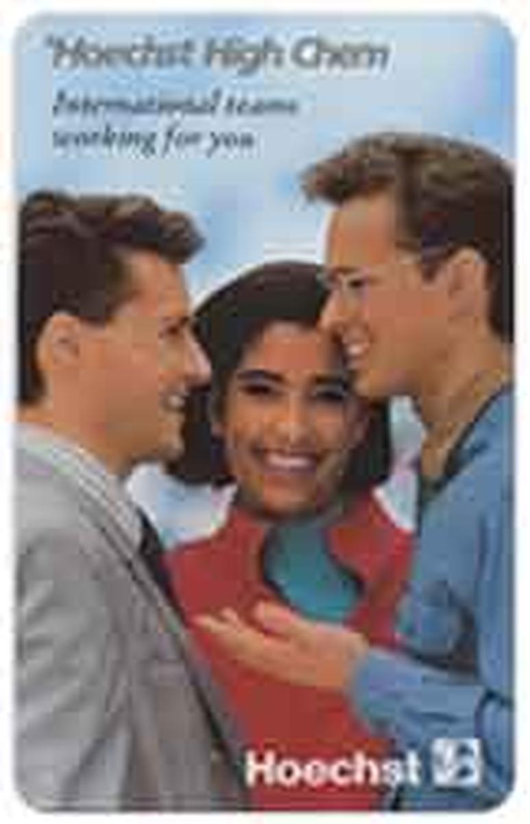 This collectible phone card prominently features the branding of Hoechst, a multinational chemical and pharmaceutical company. The card displays the phrase "Hoechst 25u" and "Hoechst High Chem - International Teams Working for You," highlighting the company’s corporate message and global collaboration theme. The design integrates the Hoechst logo along with the mention of "TravelTel Phone Cards," indicating its use for telecommunications.
