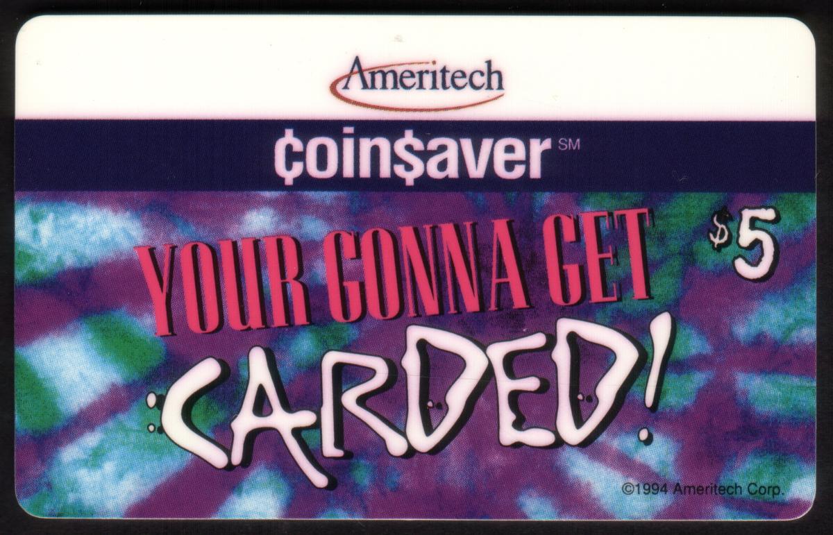 The second card’s background has a tie-dye pattern in shades of blue, green, black, and purple, overlaid with the phrase "Your Gonna Get Carded!" The word "Your" is in red with a shadow effect, while "Gonna Get" is in smaller white text, and "Carded!" is in the same jagged white font seen on the other cards. It carries a denomination of $5. The Ameritech and coin$aver branding are similarly positioned at the top.