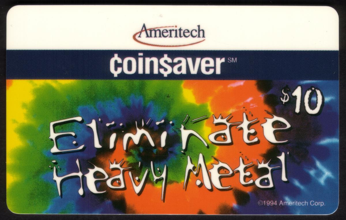 These three collectible phone cards are part of the Coin$aver Teen Series: Prototypes (As Issued) set by Ameritech, each displaying a colorful tie-dye pattern with bold, energetic text. The first card features a swirling background of green, yellow, black, red, blue, and orange with the phrase "Eliminate Heavy Metal" written in a jagged white font with black accents, along with a denomination of $10. The Ameritech logo appears at the top center above the word "coin$aver."