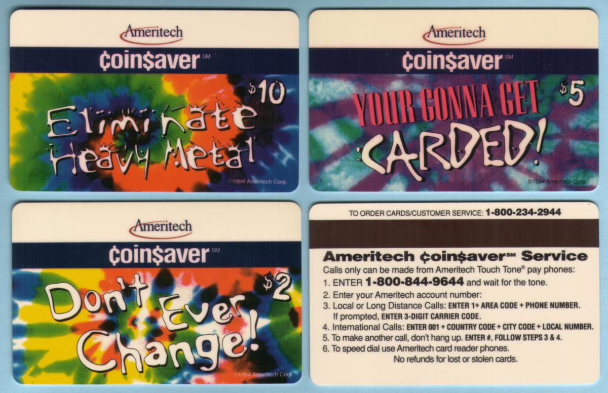 All three cards are dated 1994 Ameritech Corp. and showcase an artistic, colorful design aimed at teenagers, emphasizing a fun, youth-oriented theme under the Coin$aver Teen Series.