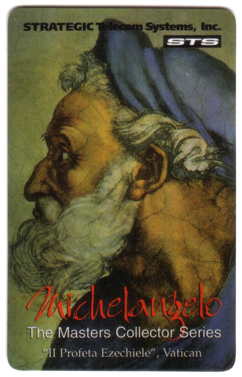 The card includes text with the title "The Masters Collection: Michelangelo: 'Il Profeta Ezechiele' Ezekiel" and is issued by Strategic Telecom Sys. The design uses a combination of muted earth tones and vivid highlights to capture the depth and intensity of Michelangelo’s masterful brushwork. The overall presentation honors the religious and artistic significance of this renowned Renaissance masterpiece housed in the Vatican.