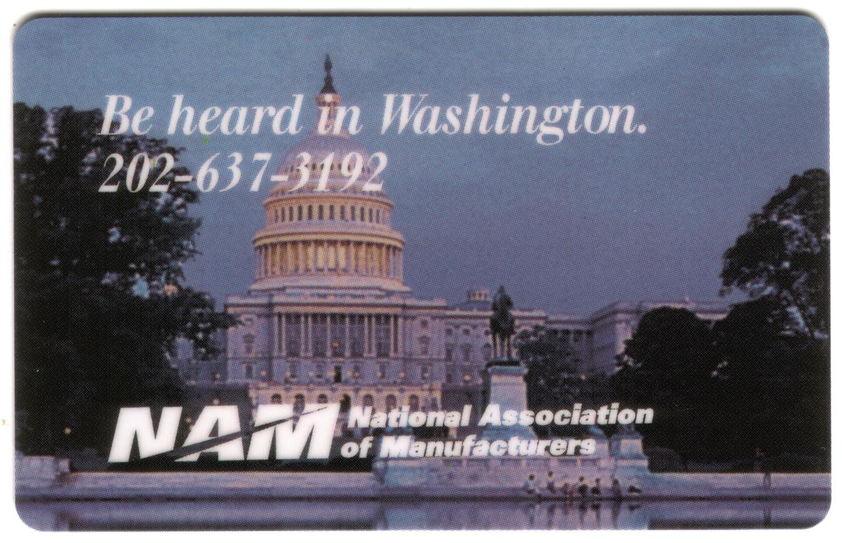 At the top of the card, the text “NATIONAL ASSN OF MANUFACTURERS” appears prominently in uppercase letters. Beneath it, the slogan “BE HEARD IN WASHINGTON” is displayed, emphasizing the card’s promotional message connected to the National Association of Manufacturers (NAM). The card promotes themes of Americana, American historical landmarks, sightseeing, travel, and national monuments related to Washington, DC.