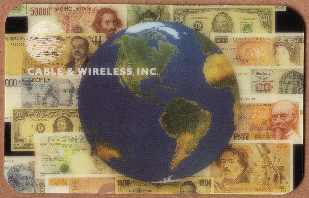The card bears the corporate trademark and logo of "CABLE & WIRELESS, INC." printed in bold white letters across the center-left portion of the card overlaying the globe and currency background. The top left corner shows the cable globe symbol, a stylized representation of a globe with horizontal lines and a segmented circle, reinforcing the global and international telecommunications theme. This card is titled "Grant 10u Moneycard: World Currency & Globe First Issue" and highlights the concept of world money and global communication.