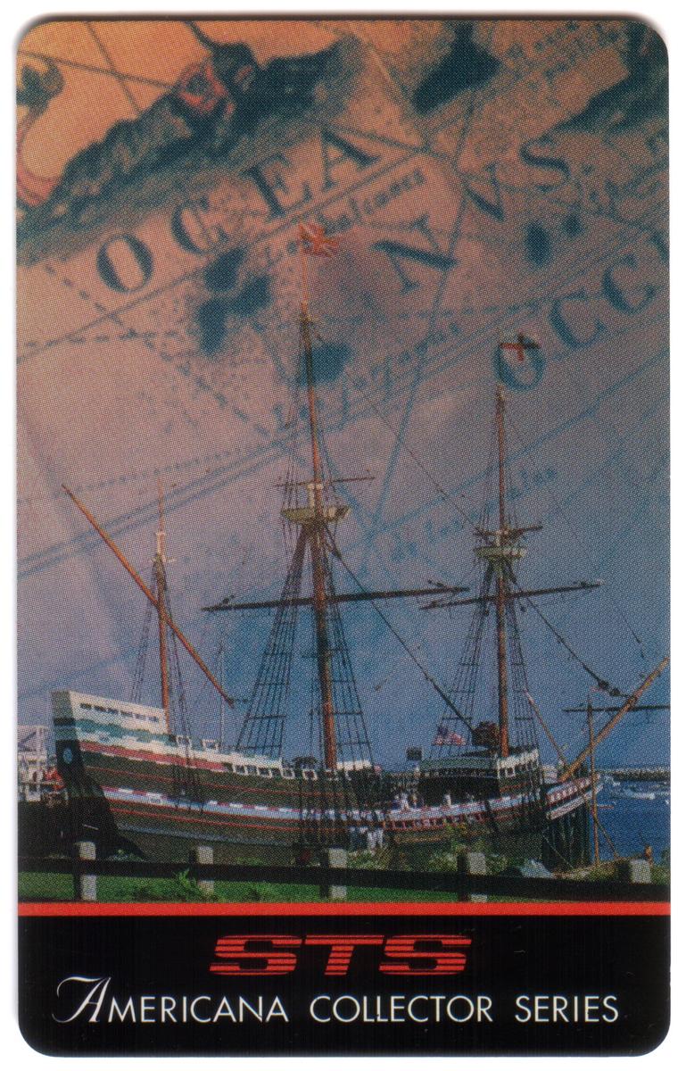 This collectible phone card features a photographic image of the Mayflower ship prominently displayed in a harbor setting. The ship is shown at dock, with its sails furled and the wooden structure clearly visible, reflecting the historical significance of the Mayflower in American history. The water around the ship has a calm appearance, and parts of the harbor infrastructure are visible, including mooring lines and other vessel elements.