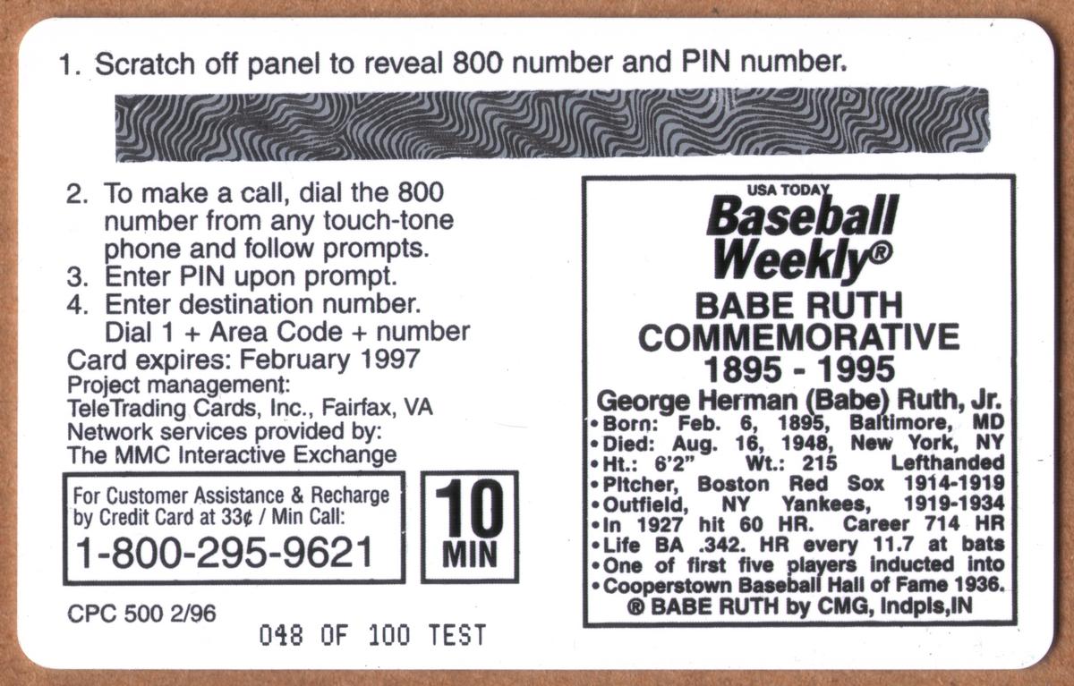 This collectible TeleTrading Card features a black-and-white action photograph of Babe Ruth batting, wearing a New York Yankees uniform. The card designates a usage value of "10 MIN" in the upper left corner, indicating its telecommunication usage time. The signature "Babe Ruth" appears in white script near the bottom right of the image.