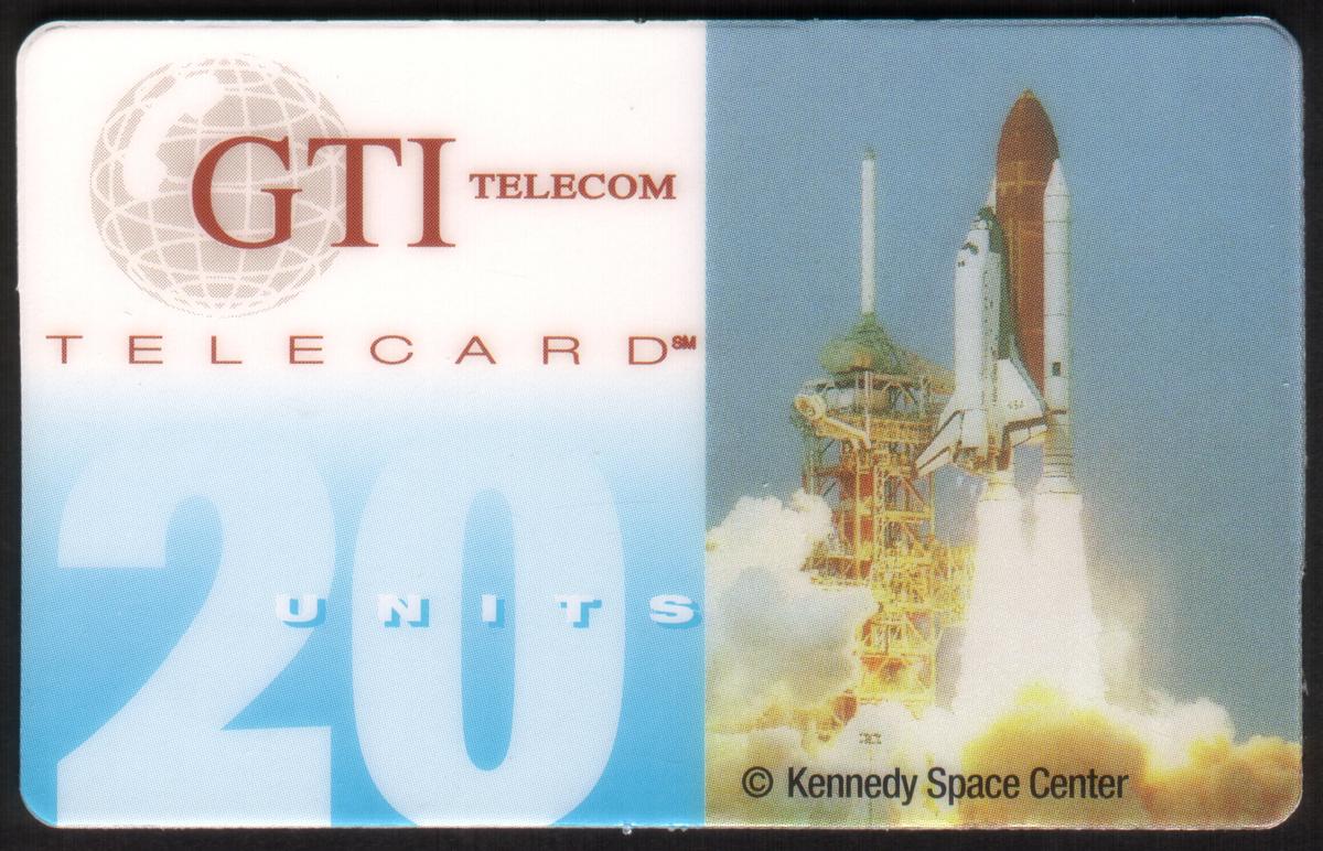 Vivid design featuring GTI TELECOM branding, 20 units, and a Kennedy Space Center shuttle launch scene symbolizing progress and global connectivity. |