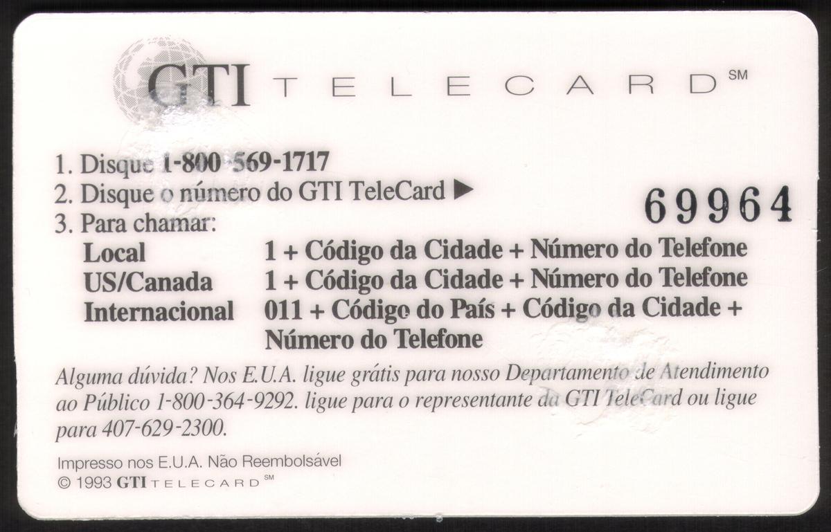 This collectible phone card is issued by GTI Telecom and prominently features the branding "GTI TELECOM" in large red and orange letters, with the word "TELECARD" beneath it in red. The card has a denomination of 20 units, clearly displayed in large light blue numbers on the left side.