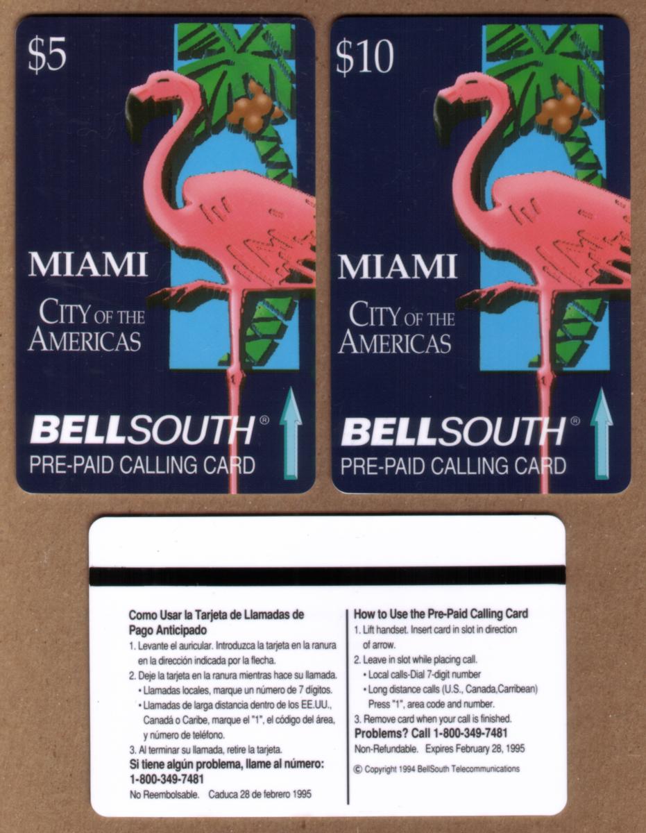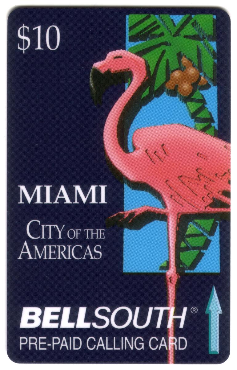 These calling cards clearly highlight Miami with colorful tropical imagery, including flamingos and palm trees, reinforcing Miami’s identity as a warm, tropical city often associated with these iconic birds and vegetation. The cards are collectible items linked to BellSouth’s prepaid calling card offerings.