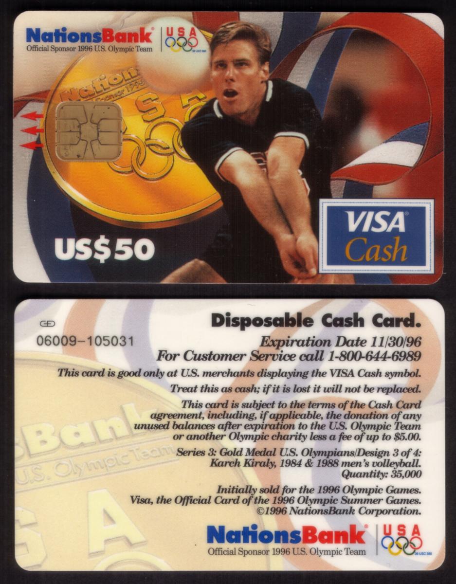 This is a Visa Cash Card issued by NationsBank featuring a gold-themed design celebrating the 1996 Olympic Games. The card highlights the sport of volleyball and prominently features Karch Kiraly, an American volleyball player known for his Olympic achievements. The card displays “Visa Cash” in the upper right corner and “NationsBank” in the lower left area. The background uses metallic gold tones with embossed elements including the Olympic rings and volleyball imagery.