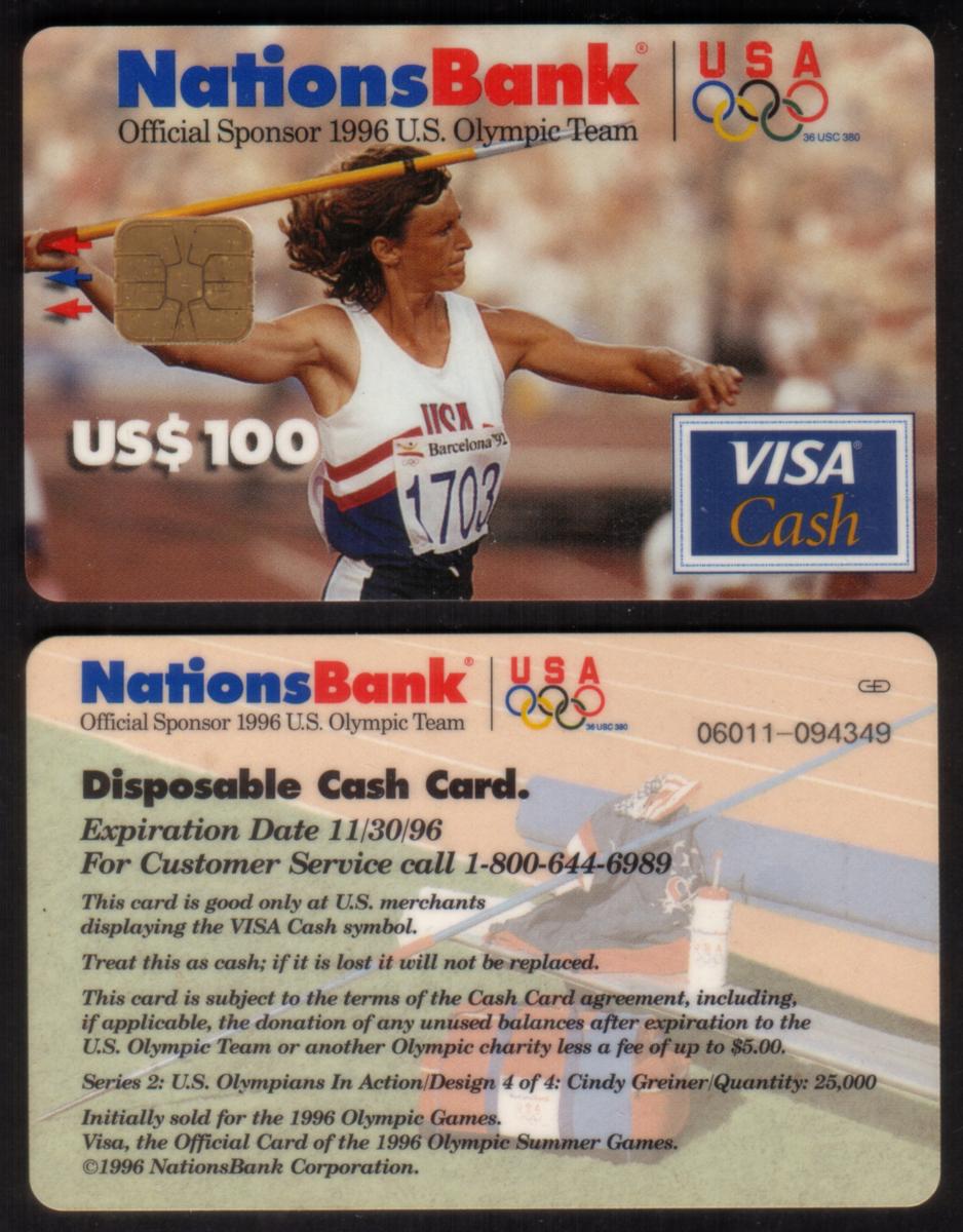 This is a collectible Visa Cash Card issued by NationsBank featuring Cindy Greiner, an Olympian known for javelin throw. The card commemorates the 1996 Olympics and has a stored value of $100. It is a smart chip card designed for electronic transactions, integrating a visible microchip on the front. The design incorporates a photograph of Cindy Greiner in her athletic pose, likely related to the javelin event, emphasizing her participation in the Olympics.
