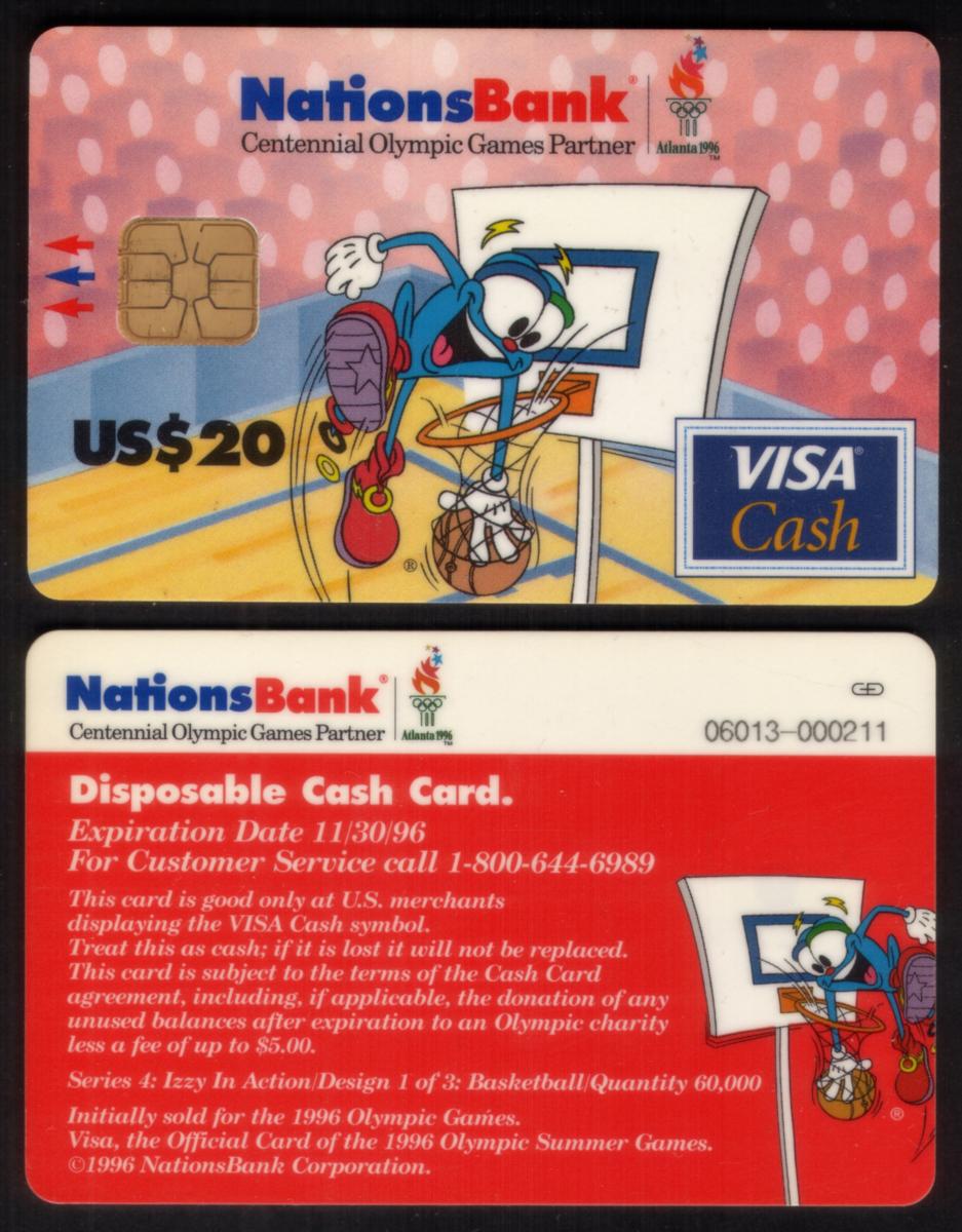 Text on the card clearly states "1996 Olympics" along with "VISA Cash" in the upper portion, emphasizing its function as a stored value bank card for use during the Games. The card’s surface includes a visible embossed chip in the center-left area, a key feature of smart cards, enabling electronic transactions. This Visa Cash Card is marked as “USED” and combines elements of Olympic memorabilia with financial functionality.
