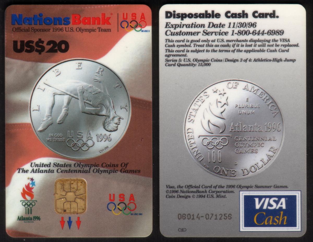 Atlanta 1996 Olympic high jump smart card with coin design, Nations Bank branding, $20 value, and limited-use prepaid features for collectors and history enthusiasts. |