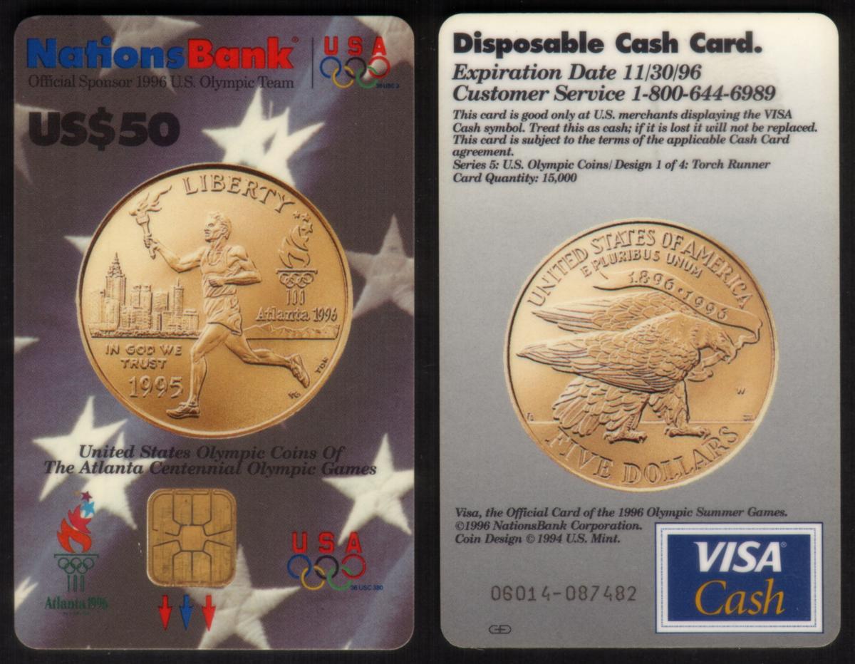 Atlanta 1996 Olympic torch runner themed $50 Visa Cash card featuring coin imagery, microchip, official logos, and collectible Olympic memorabilia. |
