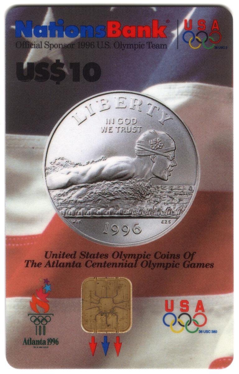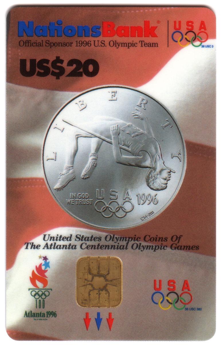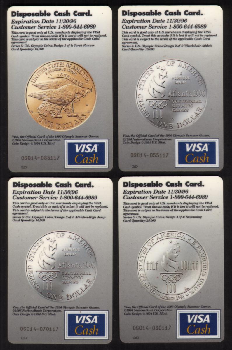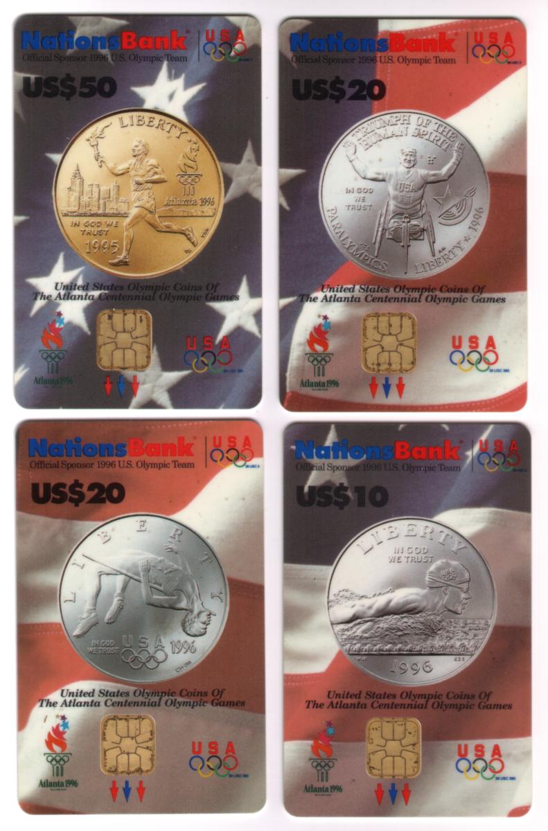 The images show a set of four NationsBank Visa Cash Cards issued as collectible items for the 1996 United States Olympic Team. Each card features a unique depiction of a United States Olympic coin honoring the Atlanta Centennial Olympic Games. The denomination values on the cards include US$10, US$20 (two different designs), and US$50. All cards bear the NationsBank logo with the text "Official Sponsor 1996 U.S. Olympic Team" alongside the USA Olympic logo with interlocking Olympic rings and the color scheme of the American flag in the background.