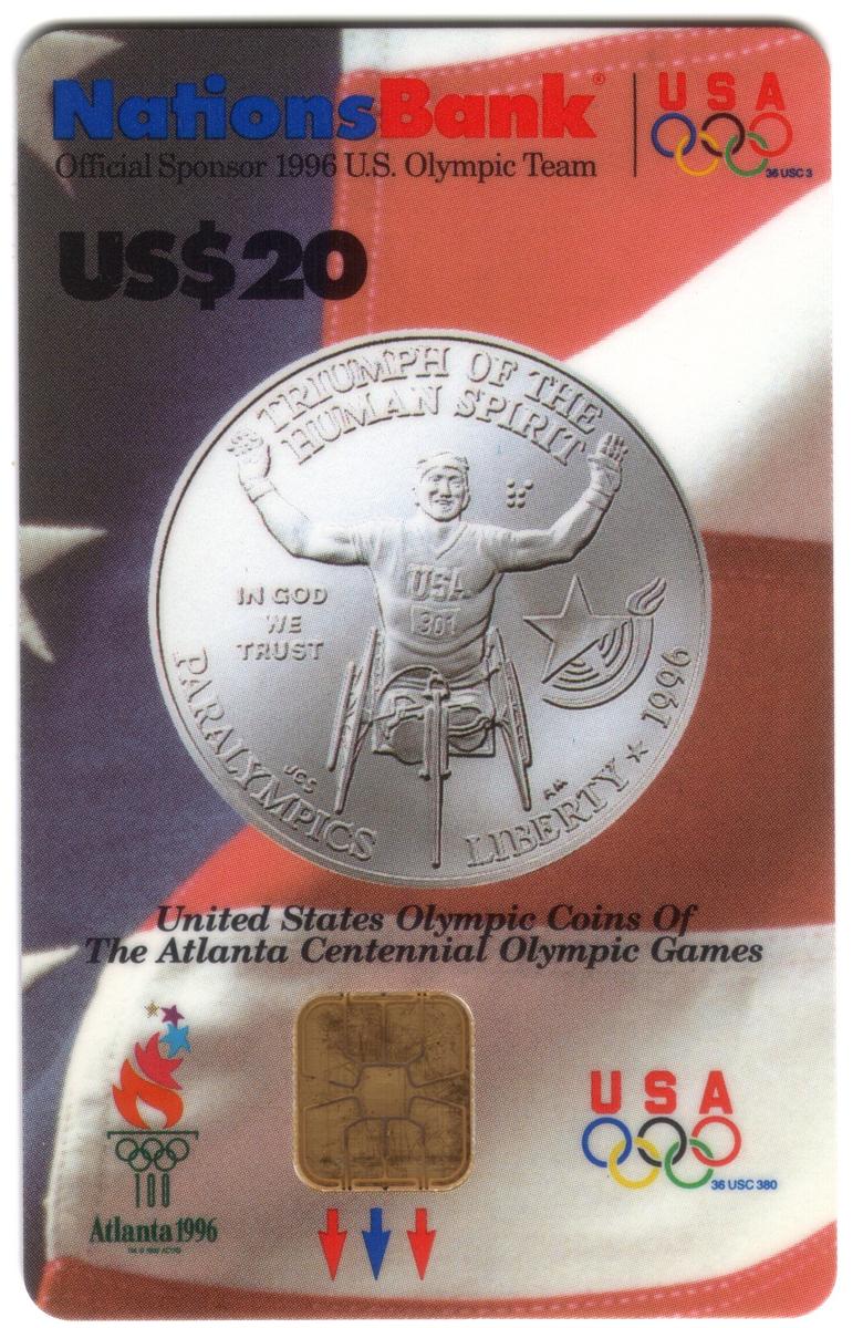 The US$10 card presents the 1996 coin with a swimmer in full stroke, labeled "LIBERTY," "IN GOD WE TRUST," and "1996." Below the coin, text states "United States Olympic Coins Of The Atlanta Centennial Olympic Games," with the Atlanta 1996 Olympic flame and rings logo located beneath. The US$20 cards depict two different coins: one shows a high jumper clearing the bar, inscribed "LIBERTY," "IN GOD WE TRUST," “USA,” the Olympic rings, and "1996," while the other shows an athlete in a wheelchair celebrating with arms raised, with the inscription "TRIUMPH OF THE HUMAN SPIRIT," "PARALYMPICS," "LIBERTY," "IN GOD WE TRUST," "USA," and "1996." Both feature the same Olympic flame logos and series text as the US$10 card.