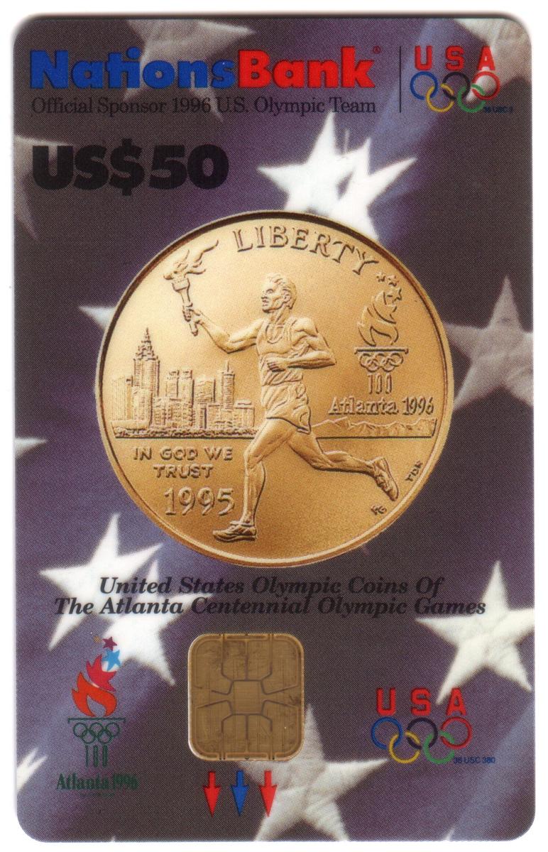 The US$50 card features a distinct gold-colored coin of a torch bearer running past a city skyline. The inscriptions include "LIBERTY," "IN GOD WE TRUST," "1995," and the Olympic rings with "III Atlanta 1996." The card retains the NationsBank sponsorship mark, USA Olympic rings logo, and Atlanta 1996 Olympic flame logos similar to the other cards in the set. Each card contains a visible chip, classifying them as Visa Cash Cards, designed for stored value use with collectible Olympic sports coin imagery from the 1996 Atlanta Olympics.