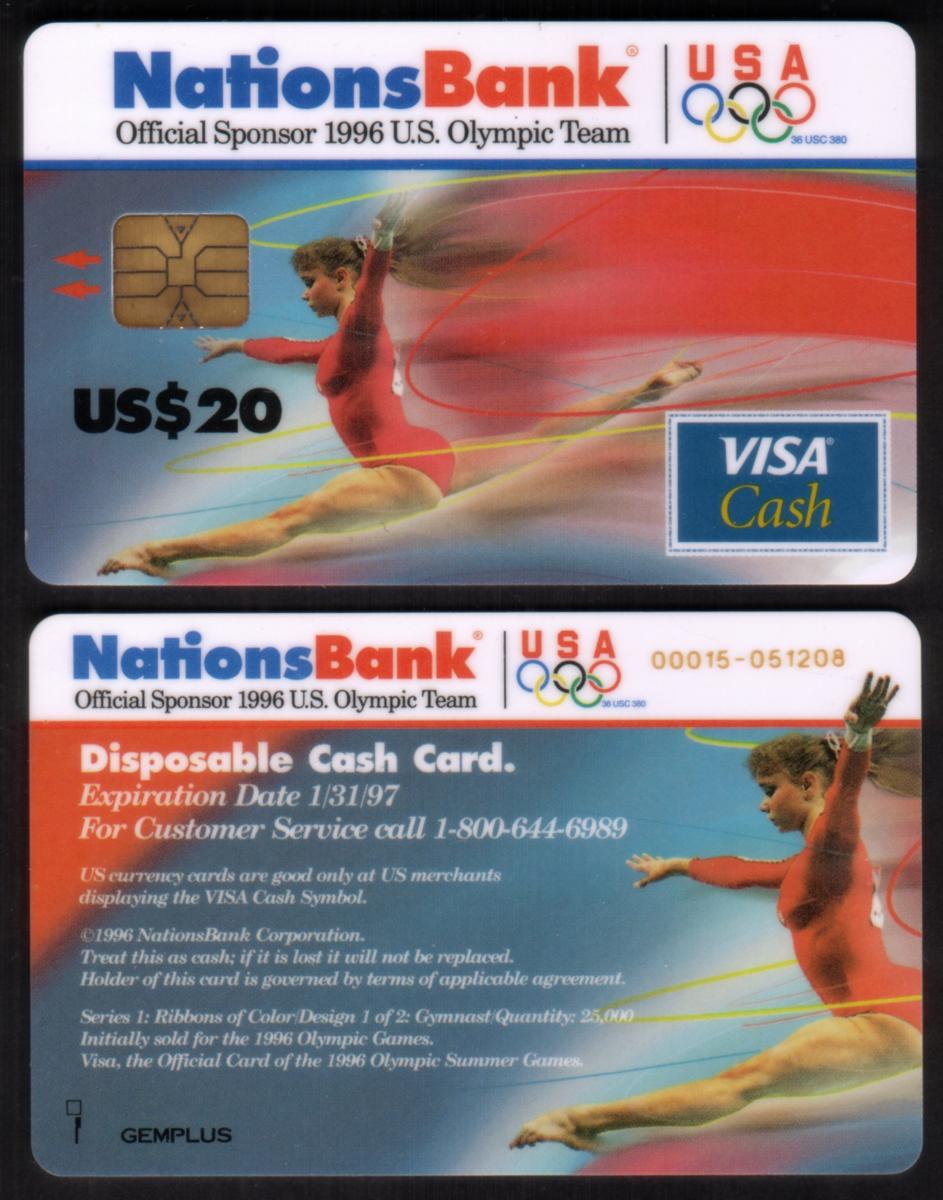 The card’s text includes "VISA CASH," "Gemplus," "NationsBank," and the denomination "$20". The overall design emphasizes the 1996 Olympic Games with a clear, bright, and colorful presentation celebrating gymnastics.