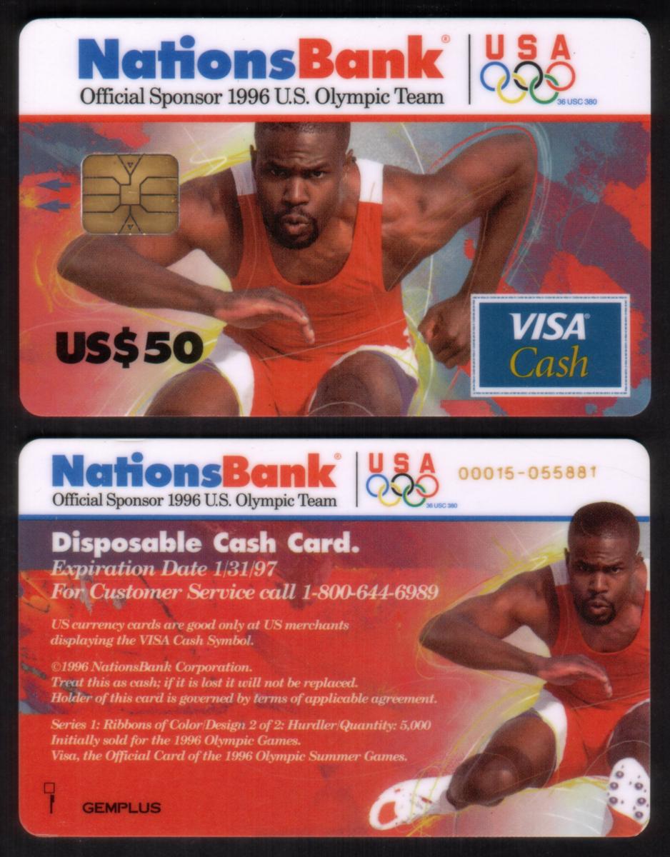Additional information on the front includes the words “1996 Olympics Visa Cash” and “NationsBank,” anchoring the card’s identity to the 1996 Summer Olympics and its financial backing. This card is a collectible item commemorating Olympic hurdling and the 1996 U.S. Olympic team, combining sports imagery with financial technology through the Visa Cash system.
