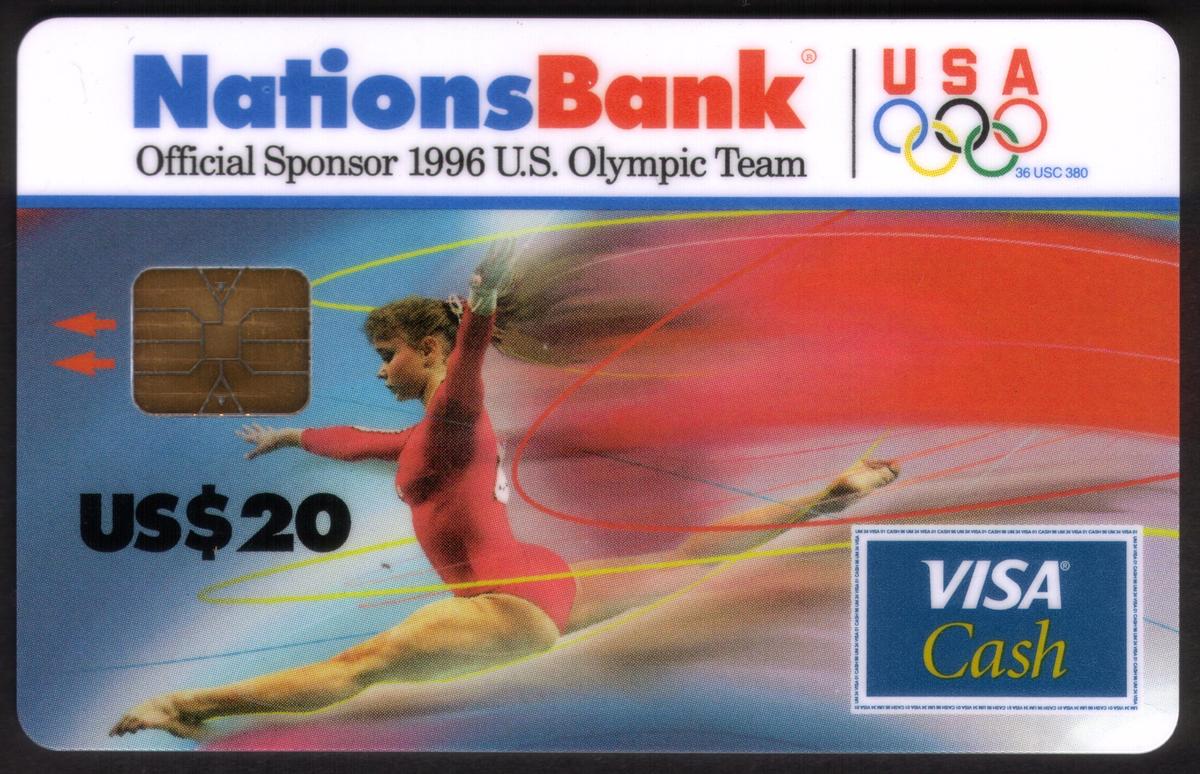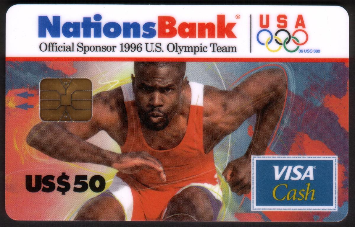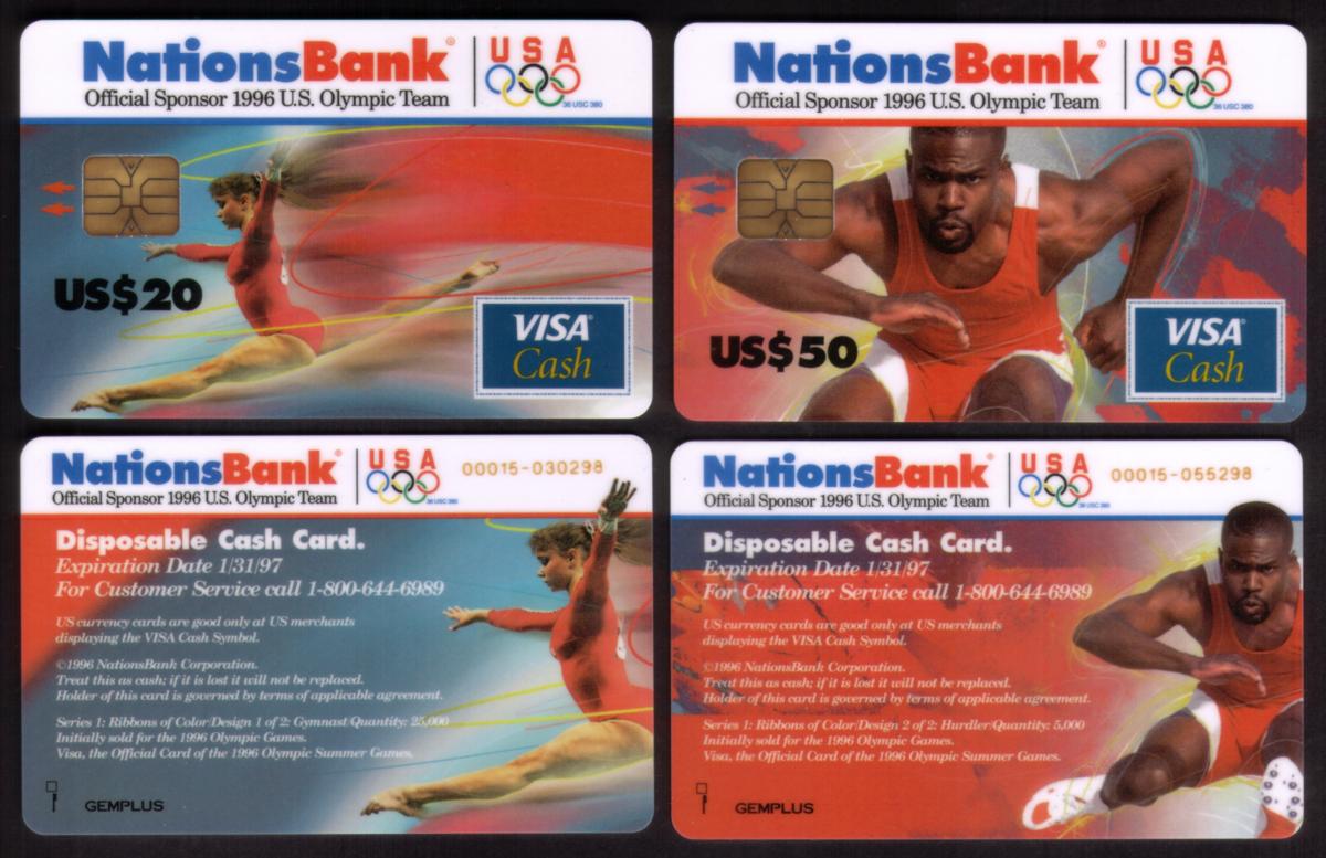 These are two NationsBank Visa Cash Cards issued as collectible stored value cards for the 1996 U.S. Olympic Team. Both cards prominently display the NationsBank logo with the text "Official Sponsor 1996 U.S. Olympic Team" positioned below it. The upper-right corner of each card features the USA Olympic logo with the five interlinked Olympic rings and the letters "USA" in red. Each card is equipped with a gold embedded chip on the left side, indicating their functionality as smart cards.