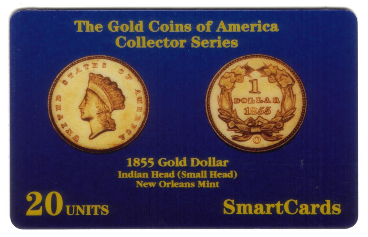 Beyond showcasing the coin images, the phone card provides valuable information for numismatists and collectors by highlighting the “Indian Head (Small Head)” variation of the 1855 Gold Dollar—an important classification in rare coin collecting. The “20 Units” notation at the bottom left indicates the card’s prepaid value, linking its collectible nature with practical telecommunications use. Meanwhile, the brand name “SmartCards” appears prominently on the bottom right, identifying the card as part of a specialized collector series that bridges the worlds of numismatics and everyday functionality.