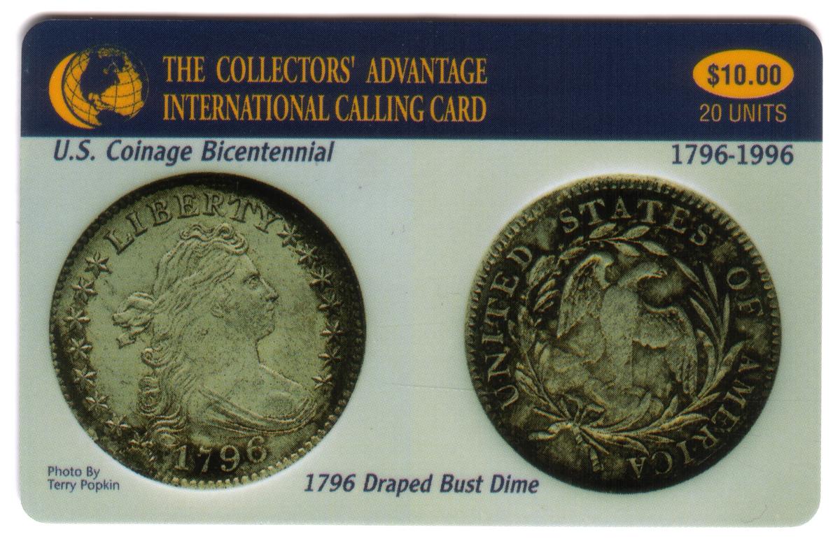 This collectible card features the 1796 Draped Bust Dime, an early piece of U.S. coinage. The card highlights the bicentennial of U.S. coinage and presents a detailed image of the dime, displaying the Draped Bust design. This design was used on U.S. dimes during the late 18th century, an important era in American numismatics.