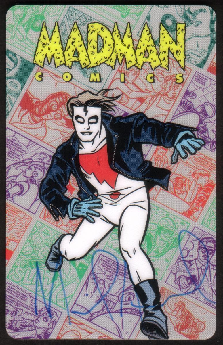 The card includes the text "5m Madman Comics With Madman Running (by Michael Allred) Signed" and identifies the issuer as Argo City Company. The design places emphasis on artistic elements blending fantasy and comic animation styles, reflecting the insane and crazy flair typical of Madman Comics. The presentation celebrates a mix of cartoons and comic art in a collectible format.