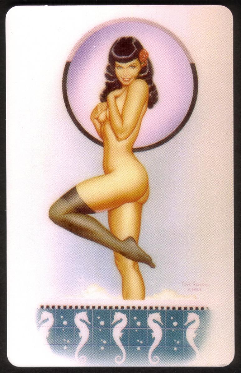This collectible chip card features a classic pinup modeling image of Bettie Page, created by artist Dave Stevens in 1990. The illustration shows Bettie Page nude except for a pair of dark stockings, posing with one leg raised and crossed over the other while looking directly at the viewer with a playful, confident expression. Her iconic black hair with bangs and a red flower accessory are prominent.