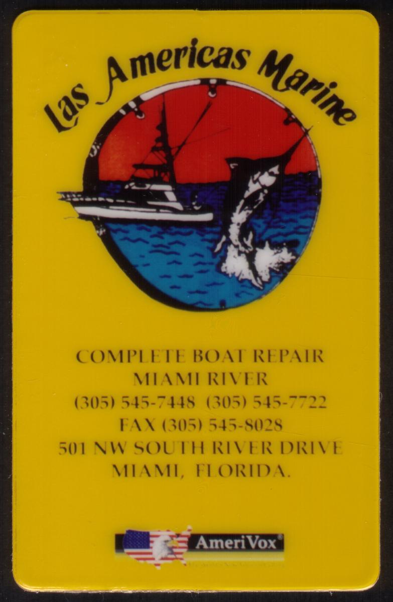 Text on the card identifies “Las Americas Marine - Complete Boat Repair - Miami Florida,” indicating the business associated with the card. Additional details include the location “NW South River Drive,” which situates the scene along this specific stretch of the Miami River. The card also includes the word “PROOF” and the name “AmeriVox,” pointing to the production or branding involved with this collectible item.