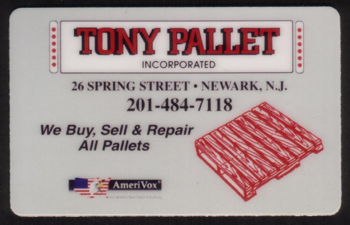 This card serves as a collectible promotional item advertising Tony Pallet Inc. in Newark, New Jersey, highlighting its role in pallet transactions. The card is a tangible piece used for advertising within the hardware and lifting industry.