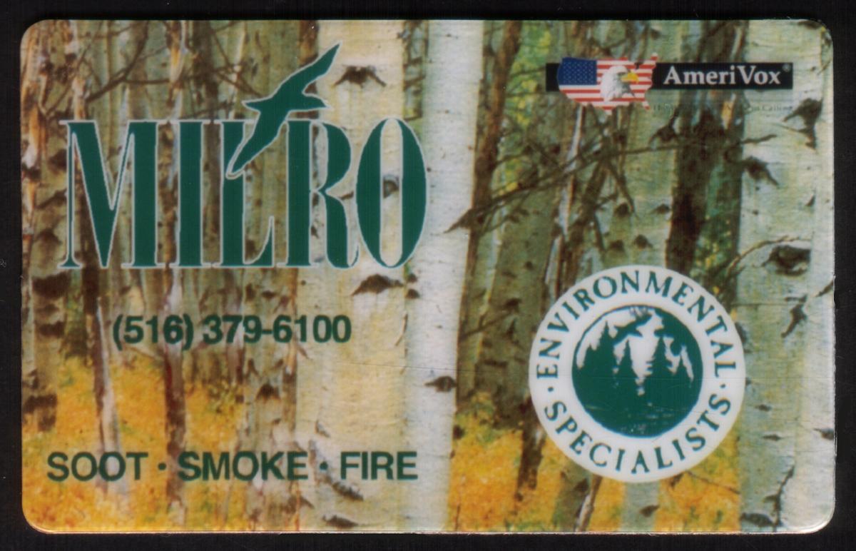 In the lower portion of the image, the text "Environmental Preservations" is clearly printed, reinforcing the card’s theme. The card also includes the name "milro inc" and "Milro Environmental Specialists New York," indicating the organization associated with environmental efforts related to soot, smoke, and fire. These elements highlight the card’s focus on environmental issues and the company's specialized work.