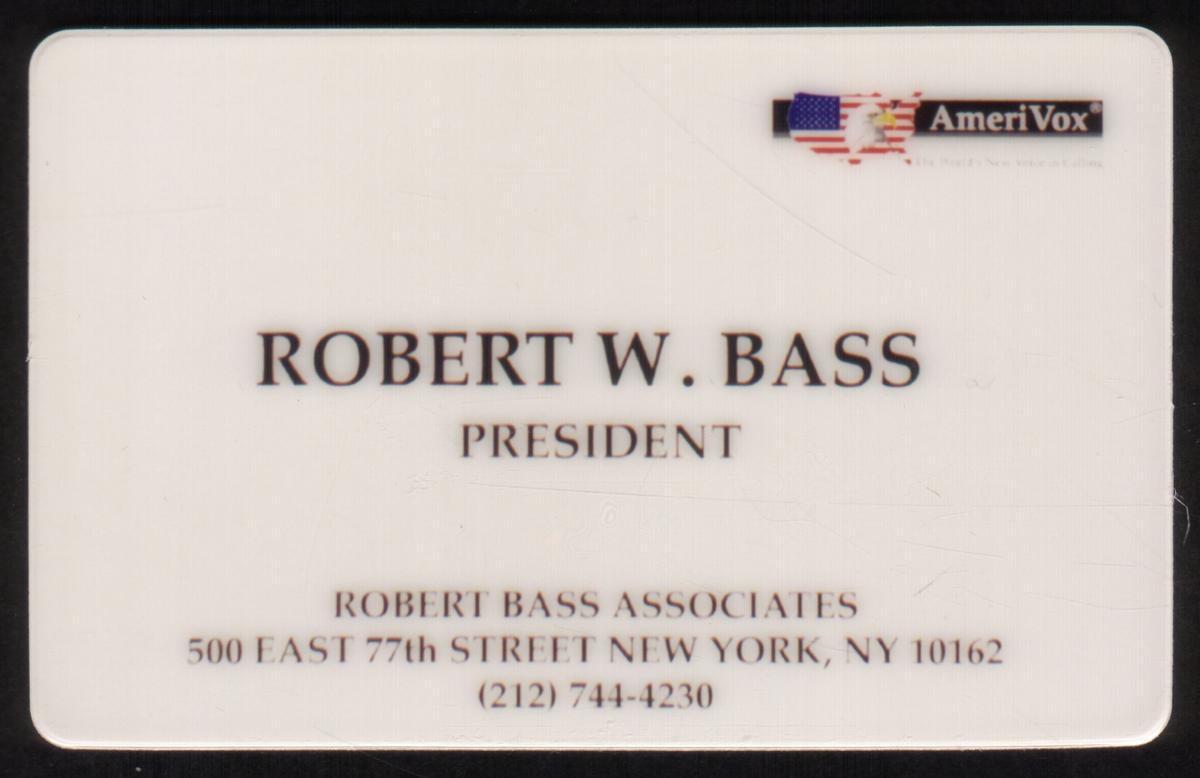 This collectible business card features a prominent printed signature of Robert W. Bass, who is identified as the President. The card is associated with AmeriVox and is marked as a PROOF. The card has a clean, professional design with the text placed on a white background.