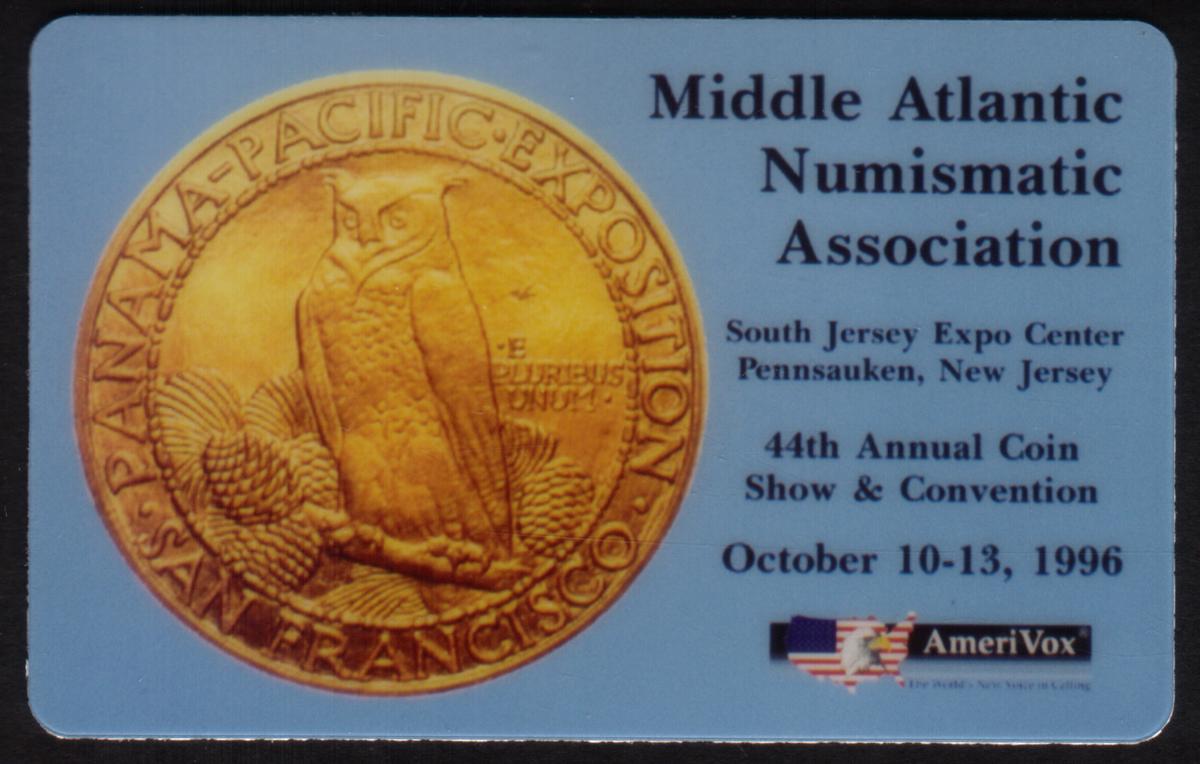 San Francisco is also mentioned on the card, aligning with the themes of coin collecting and money. The card's style, logos, and text confirm it is a collectible phone card associated with numismatics, coin collecting, and currency rather than a standard phone card without thematic ties. This card holds value for collectors interested in gold coins, numismatics, and regional associations such as the Middle Atlantic Numismatic Association.
