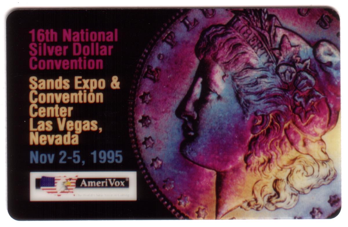 This collectible phone card features the 16th National Silver Dollar Convention held at the Sands Expo and Convention Center in Las Vegas, Nevada, dated November 1995. The card highlights numismatics and coin collecting themes, specifically silver coins, which aligns with the convention's focus. The name AmeriVox is prominently displayed on the card, indicating the issuing or sponsoring entity related to the phone card.