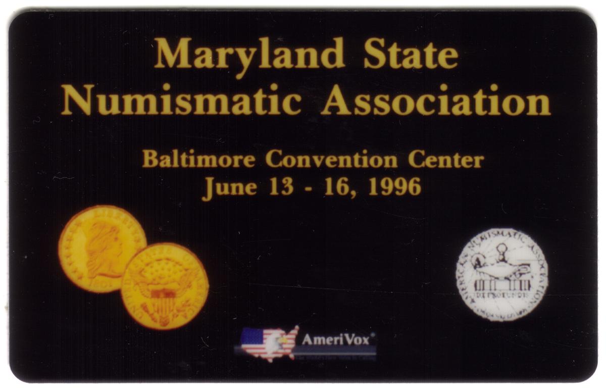 This collectible card prominently features a gold coin design titled "Carson City King (AVX)." The coin imagery is detailed with an intricate rendering of the coin’s face, emphasizing the metallic gold color and classic numismatic elements. The card is associated with the Maryland State Numismatic Association and references the Baltimore Convention Center, dated 6/96. Alongside the coin imagery, the card includes the ANA logo, linking it to the American Numismatic Association, which is well-known in coin collecting circles.
