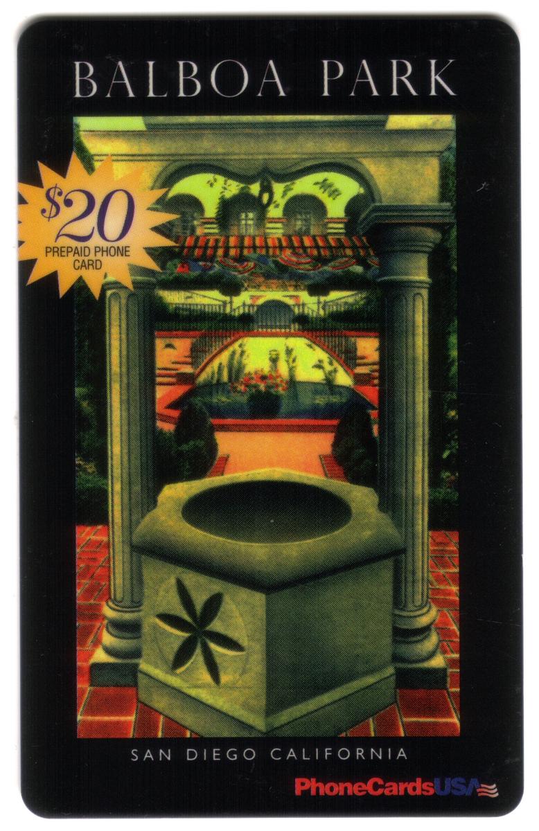 Text on the card includes "Balboa Park" prominently displayed at the top left corner, with "San Diego California" beneath it. The card also has a denomination of "$20" located in the upper right corner. Additional text at the bottom right corner reads "Phone Cards USA," indicating the issuing entity. The card uses clean, modern typography in white and blue tones that contrast sharply against the natural and architectural imagery.