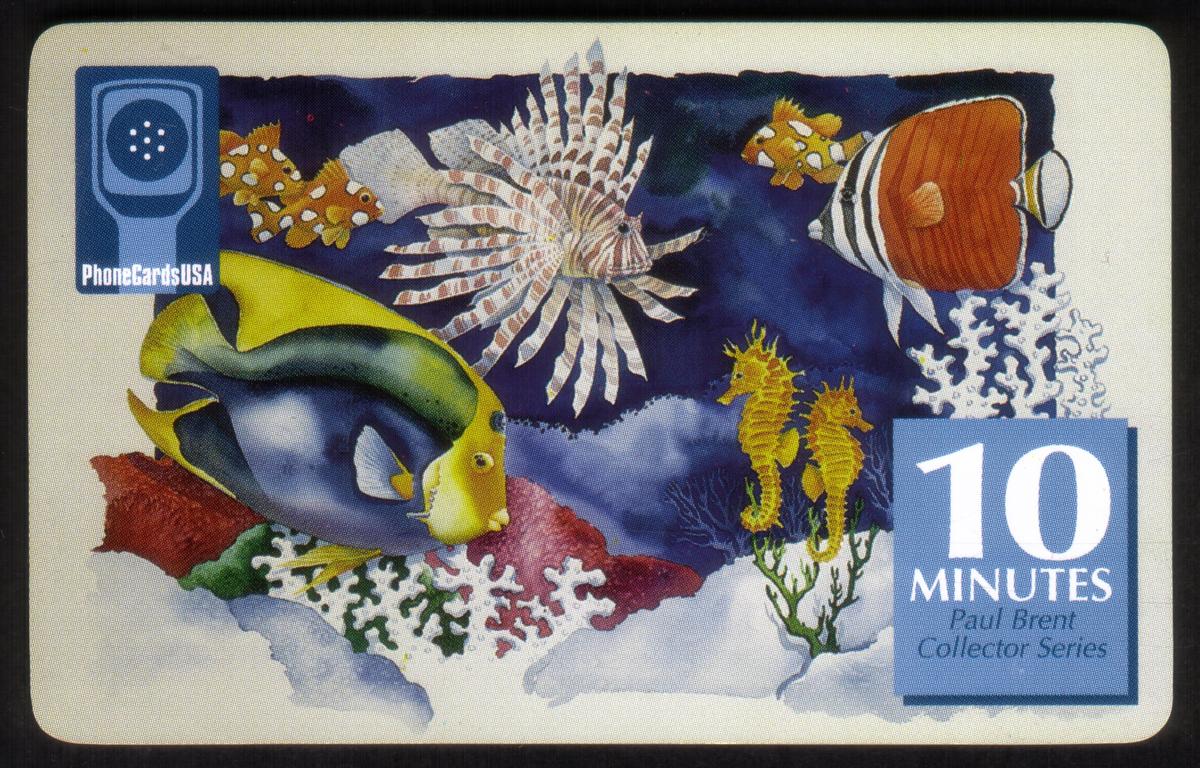 This collectible phone card features a vibrant watercolor painting by artist Paul Brent, depicting a rich underwater scene teeming with tropical fish and coral. The artwork displays a variety of colorful fish swimming among intricate coral formations, emphasizing marine life such as seahorses and other sea creatures. The composition captures the beauty of the ocean’s ecosystem with detailed, artistic brushstrokes highlighting the textures and colors of the fish and coral.