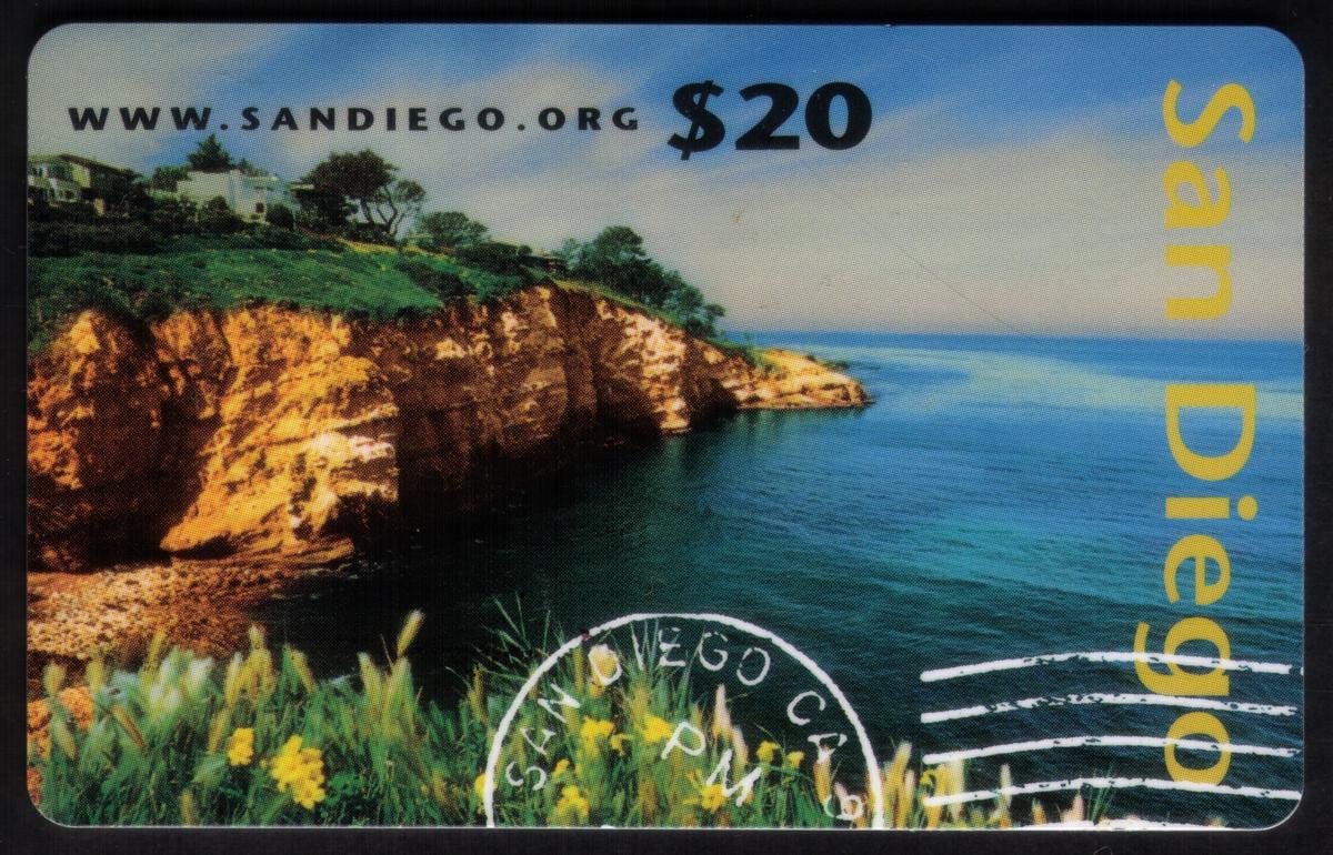 The card prominently displays the website www.sandiego.org in black lettering at the top left corner, along with a denomination of $20 in bold black text near the upper center. The words “San Diego” appear vertically in large yellow letters along the right edge of the card. A postal-style black cancellation mark reading “SAN DIEGO CAL” with a partial date imprint overlays the lower center portion, emphasizing its usage or collectible status.