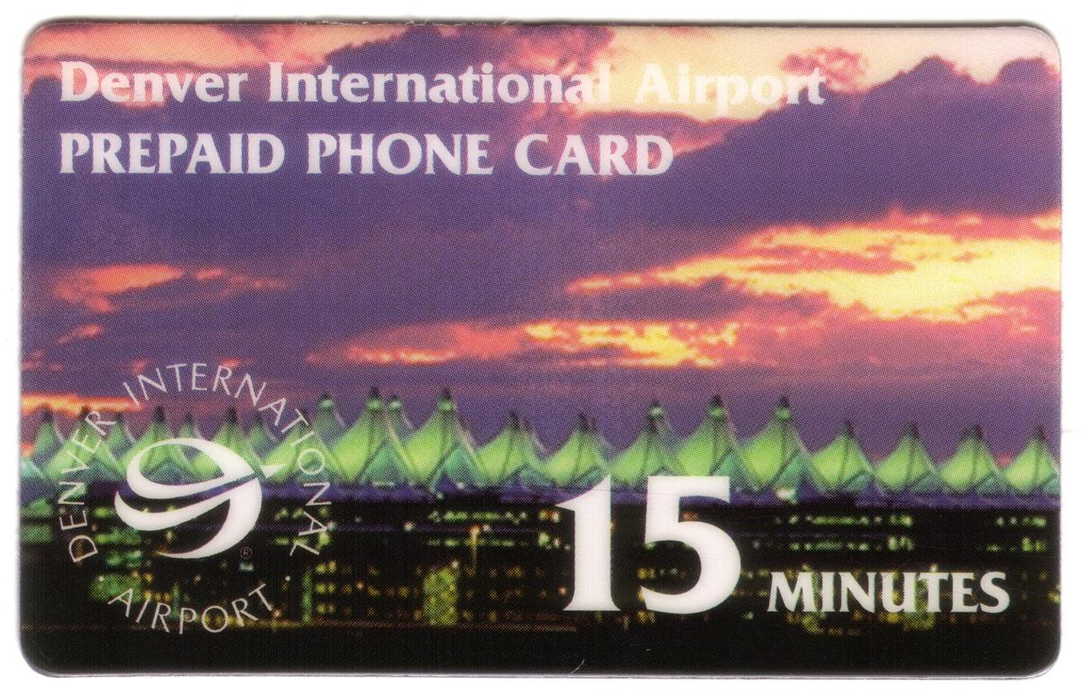 This collectible phone card features a full-color photographic image of Denver International Airport, prominently showing the station’s distinctive peaked white roof architecture set against a clear blue sky. The main terminal structure includes several large white, tent-like structures that are iconic to the airport’s design. The photo captures the airport’s modern exterior with a foreground of pavement and some airport service vehicles.