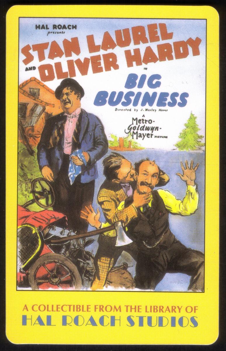This collectible phone card features a vintage movie poster for the comedy film *Big Business* starring Stan Laurel and Oliver Hardy. The card highlights the classic image of the two iconic actors, known collectively as Laurel and Hardy, characterized by their distinctive facial expressions and attire. Stan Laurel is depicted crying, holding a handkerchief, while an axe is prominently displayed nearby, emphasizing a key element or motif from the film.