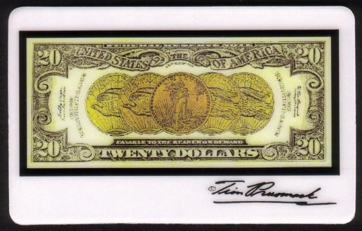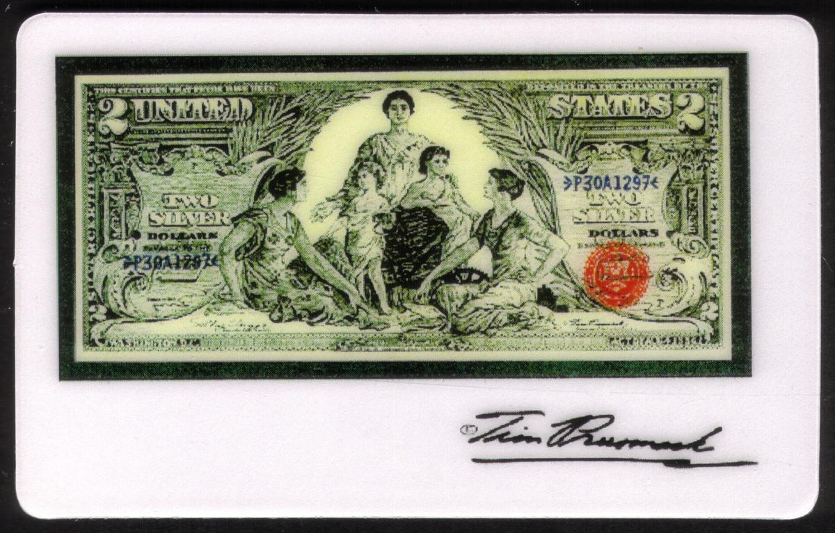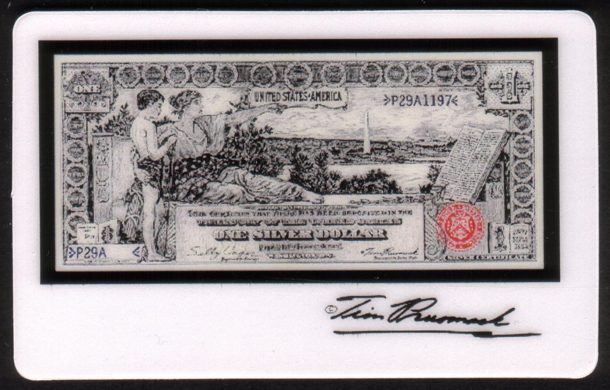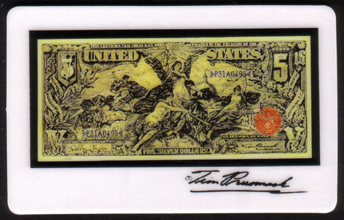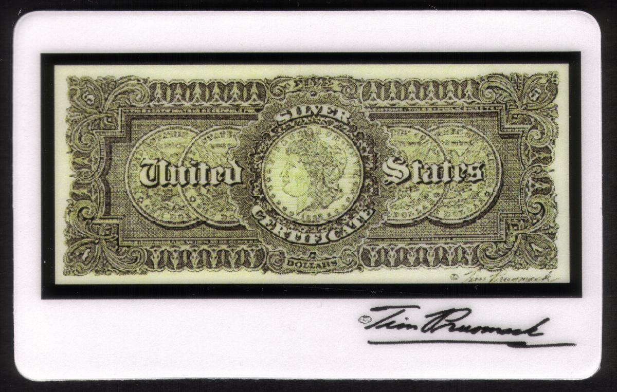 This collection is categorized as currency collectibles and artistic reproductions of historical money designed and signed by Tim Prusmack. The cards are ideal for currency enthusiasts focusing on USA currency, British pounds, silver certificates, gold certificates, and symbolic numismatic art. The cards reflect intricate details and authentic designs important to collectors of historical monetary notes.