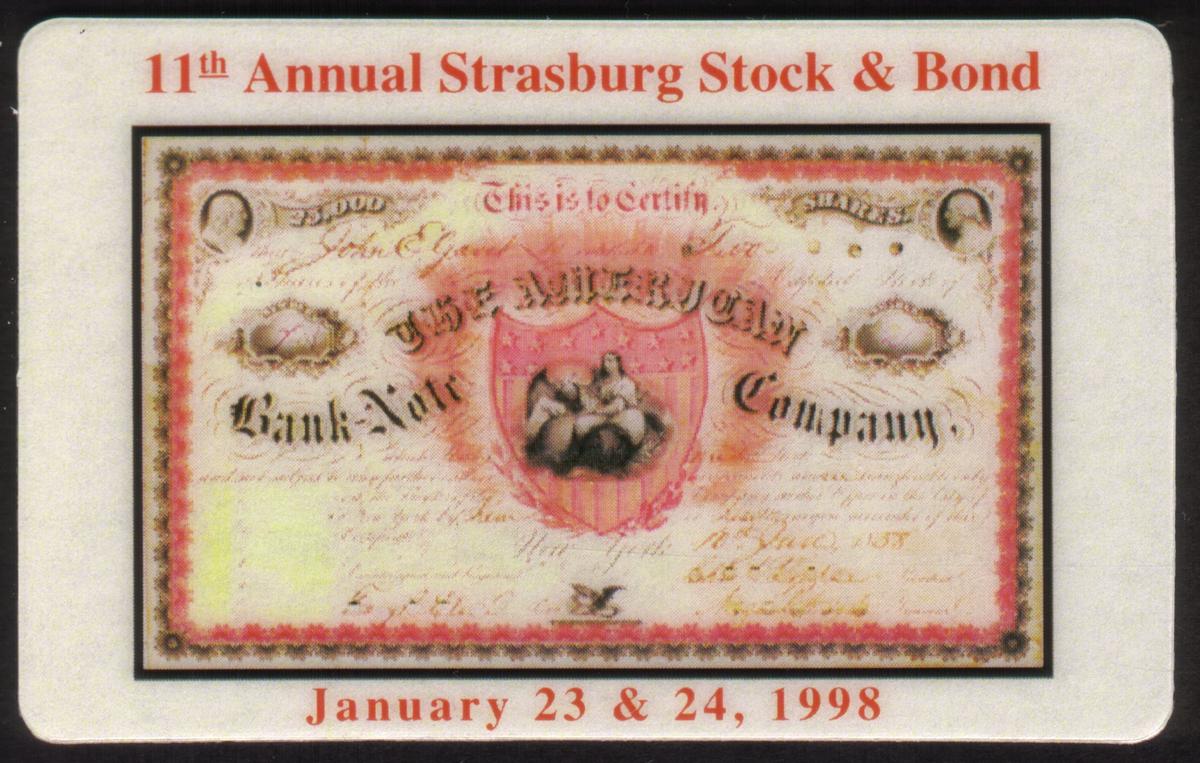 Above the certificate, the text "11th Annual Strasburg Stock & Bond" is displayed in red, while below, the dates "January 23 & 24, 1998" are printed in the same color. This item reflects a collectible issued for the 11th Annual Strasburg Stock & Bond show or event, combining historic financial imagery with stock and bond collecting themes.