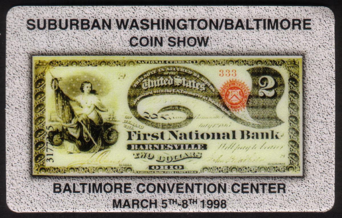 The front of the card includes the name R.M. Smythe & Co., located in Barnesville, Ohio, indicating a connection to this well-known dealer or service in the field of numismatics. The illustration or photograph appears to commemorate or represent the Suburban Washington Baltimore Show held in March 1998 (03/98), an event that is referenced prominently and likely significant within collectible currency circles. The card also shows the designation of Tell-One Inc. (CCK), a company involved in this collectible currency item.