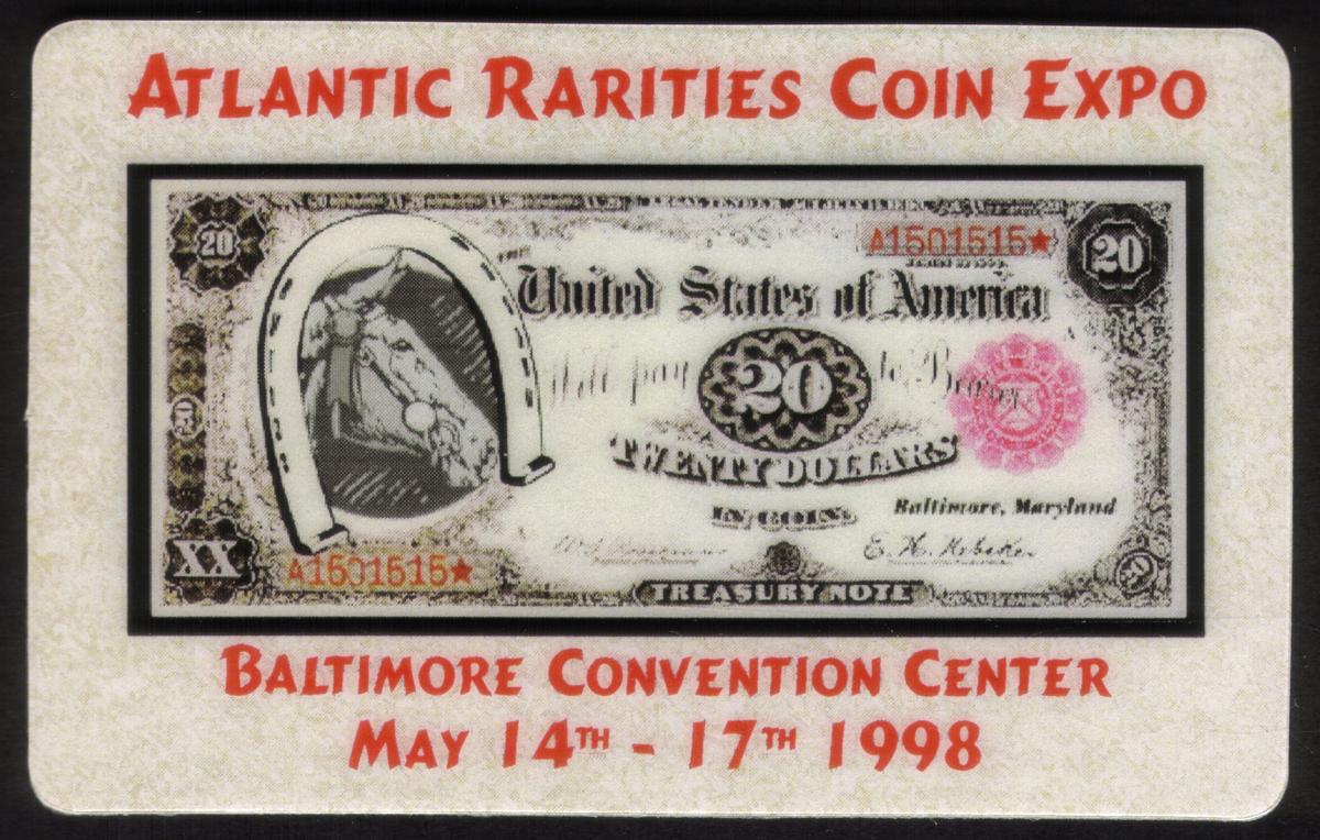 The collectible phone card displays imagery related to the 5M Atlantic Rarities Coin Expo held in Baltimore, Maryland in May 1998. The card features a depiction of a horse and a horseshoe, aligning with the theme of animals and numismatics referenced in the event. The background includes symbols and text that highlight the connection to currency and collectible money, reinforcing the numismatic focus of the Expo.
