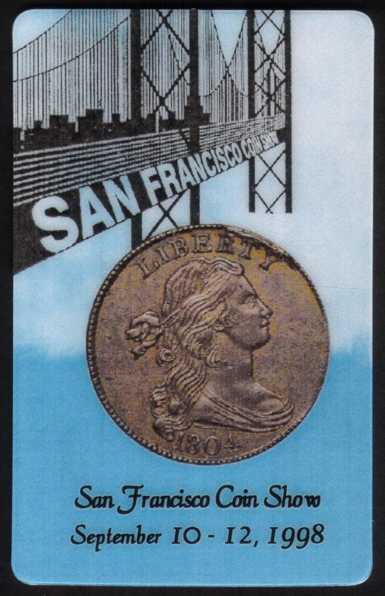 This collectible phone card features a detailed image commemorating the 5th San Francisco Coin Show held in September 1998. The artwork prominently displays the 1804 Silver Dollar coin, which is a highly renowned and rare American coin often referred to as the "King of American Coins." Positioned alongside the coin image is the Golden Gate Bridge, an iconic landmark of San Francisco, depicted in full color against a blue sky background. The presentation includes the text "5m San Francisco Coin Show (09/98)," indicating the card’s value and event association.
