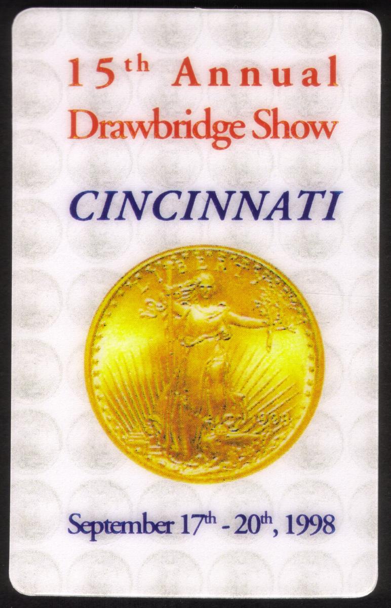 This collectible chip card features the $20 Saint Gaudens gold coin, a renowned piece in numismatics. The card commemorates the 15th Annual Drawbridge Show held in Cincinnati in September 1998. It clearly displays the image of the $20 gold piece designed by Augustus Saint-Gaudens, a celebrated American sculptor known for this classic coin design.