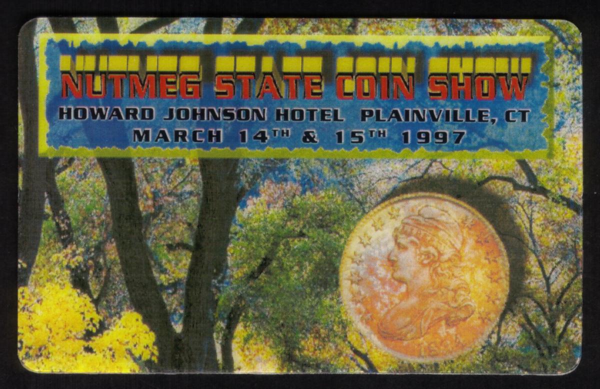 This collectible chip card is issued for the Nutmeg State Coin Show held at the Howard Johnson Hotel in Plainville, Connecticut, on March 14th and 15th, 1997. The front of the card features vibrant autumn foliage with multiple trees showcasing yellow and green leaves. Set against this leafy backdrop is an image of the Carson City King gold coin, prominently displayed on the right side. The coin's design includes a detailed profile, along with surrounding stars, representing a classic numismatic motif.