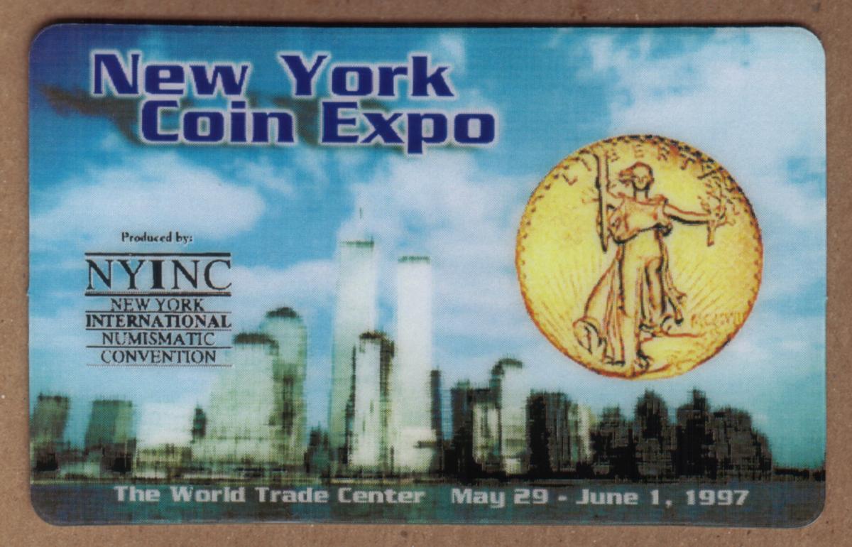 This collectible connects numismatics with a significant location and historical coin imagery, making it notable for collectors interested in coin shows, gold coins, and world trade landmarks. The card captures a moment in time celebrating both the city skyline before September 11, 2001, and the coin collecting community.